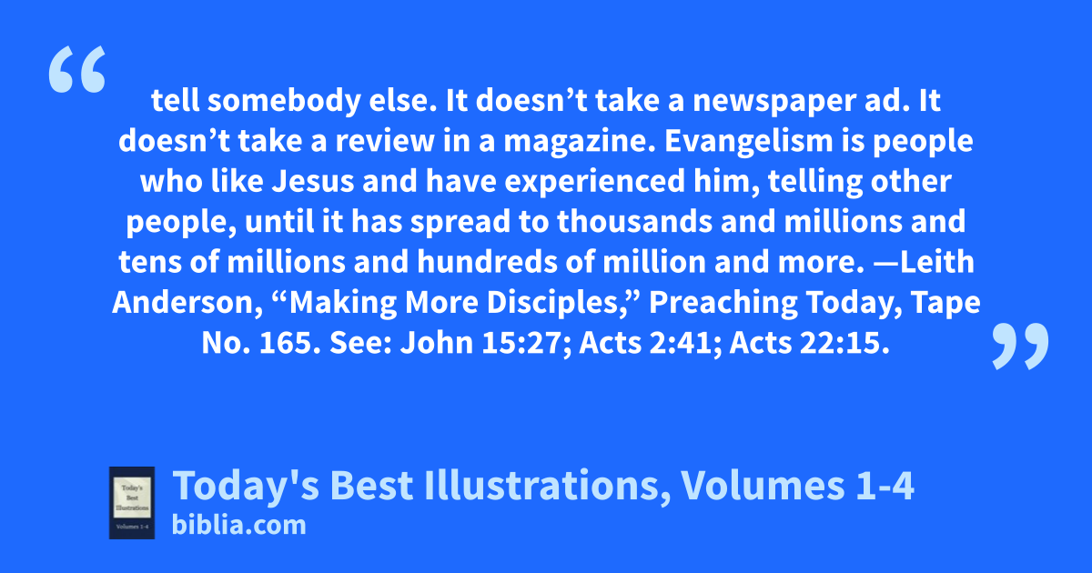 tell somebody else. It doesn’t take a newspaper ad. It doesn’t take a review in a magazine. Evangelism is people who like Jesus and have experienced him, telling other people, until it has spread to thousands and millions and tens of millions and hundreds of million and more. —Leith Anderson, “Making More Disciples,” Preaching Today, Tape No. 165. See: John 15:27; Acts 2:41; Acts 22:15.