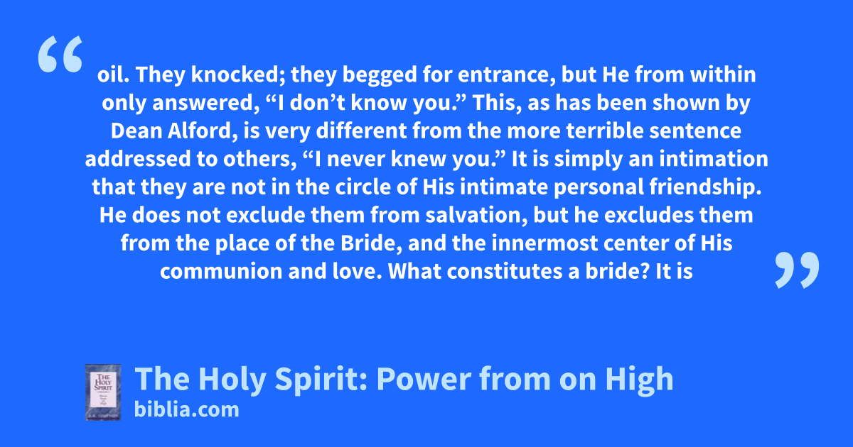 oil. They knocked; they begged for entrance, but He from within only answered, “I don’t know you.” This, as has been shown by Dean Alford, is very different from the more terrible sentence addressed to others, “I never knew you.” It is simply an intimation that they are not in the circle of His intimate personal friendship. He does not exclude them from salvation, but he excludes them from the place of the Bride, and the innermost center of His communion and love. What constitutes a bride? It is