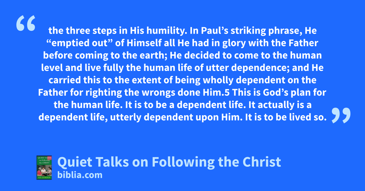 the three steps in His humility. In Paul’s striking phrase, He “emptied out” of Himself all He had in glory with the Father before coming to the earth; He decided to come to the human level and live fully the human life of utter dependence; and He carried this to the extent of being wholly dependent on the Father for righting the wrongs done Him.5 This is God’s plan for the human life. It is to be a dependent life. It actually is a dependent life, utterly dependent upon Him. It is to be lived so.