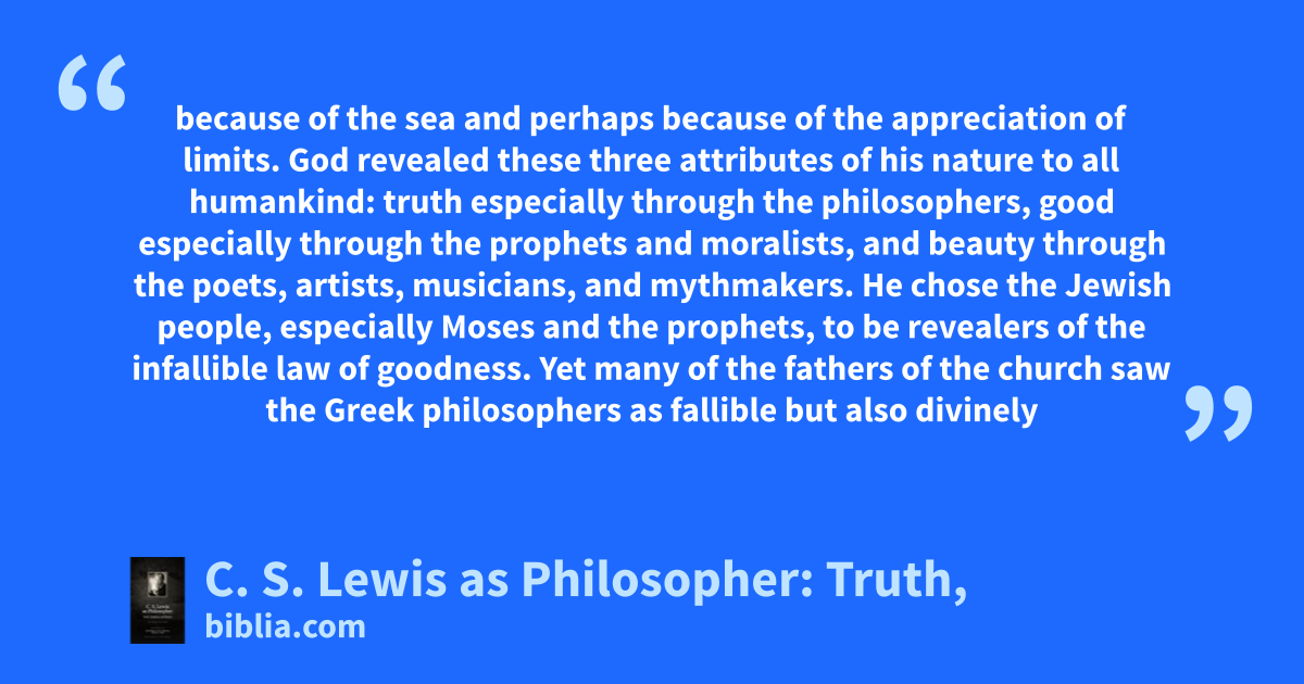 because of the sea and perhaps because of the appreciation of limits. God revealed these three attributes of his nature to all humankind: truth especially through the philosophers, good especially through the prophets and moralists, and beauty through the poets, artists, musicians, and mythmakers. He chose the Jewish people, especially Moses and the prophets, to be revealers of the infallible law of goodness. Yet many of the fathers of the church saw the Greek philosophers as fallible but also divinely
