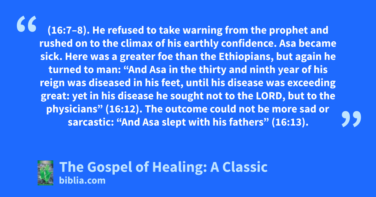 (16:7–8). He refused to take warning from the prophet and rushed on to the climax of his earthly confidence. Asa became sick. Here was a greater foe than the Ethiopians, but again he turned to man: “And Asa in the thirty and ninth year of his reign was diseased in his feet, until his disease was exceeding great: yet in his disease he sought not to the LORD, but to the physicians” (16:12). The outcome could not be more sad or sarcastic: “And Asa slept with his fathers” (16:13).