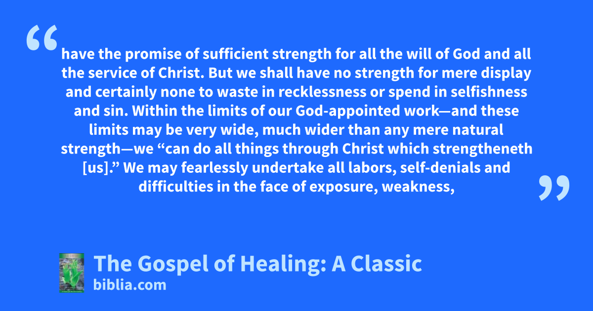 have the promise of sufficient strength for all the will of God and all the service of Christ. But we shall have no strength for mere display and certainly none to waste in recklessness or spend in selfishness and sin. Within the limits of our God-appointed work—and these limits may be very wide, much wider than any mere natural strength—we “can do all things through Christ which strengtheneth [us].” We may fearlessly undertake all labors, self-denials and difficulties in the face of exposure, weakness,