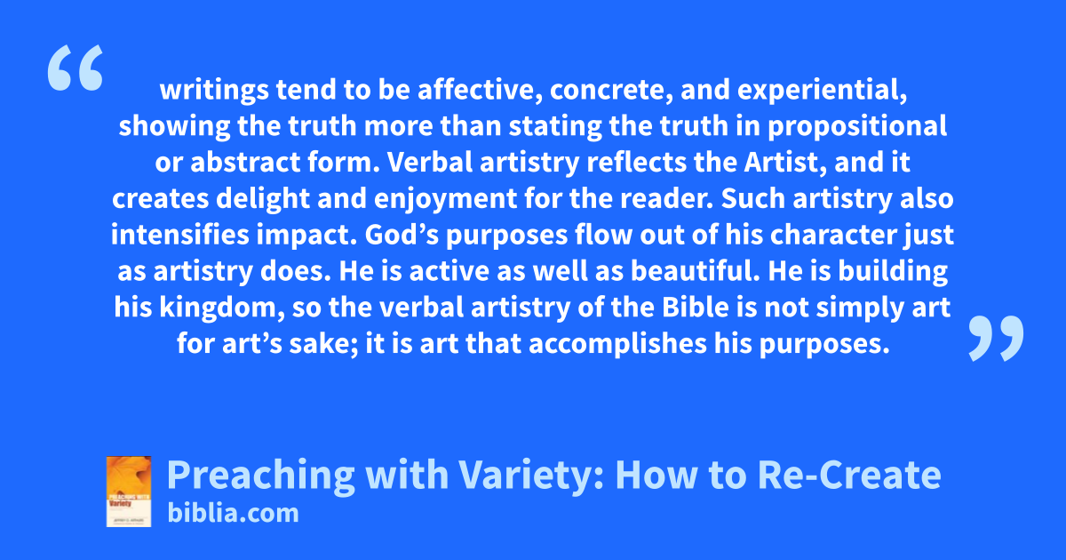 writings tend to be affective, concrete, and experiential, showing the truth more than stating the truth in propositional or abstract form. Verbal artistry reflects the Artist, and it creates delight and enjoyment for the reader. Such artistry also intensifies impact. God’s purposes flow out of his character just as artistry does. He is active as well as beautiful. He is building his kingdom, so the verbal artistry of the Bible is not simply art for art’s sake; it is art that accomplishes his purposes.