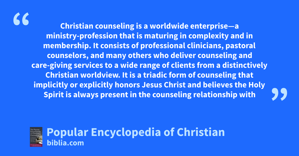 Christian counseling is a worldwide enterprise—a ministry-profession that is maturing in complexity and in membership. It consists of professional clinicians, pastoral counselors, and many others who deliver counseling and care-giving services to a wide range of clients from a distinctively Christian worldview. It is a triadic form of counseling that implicitly or explicitly honors Jesus Christ and believes the Holy Spirit is always present in the counseling relationship with