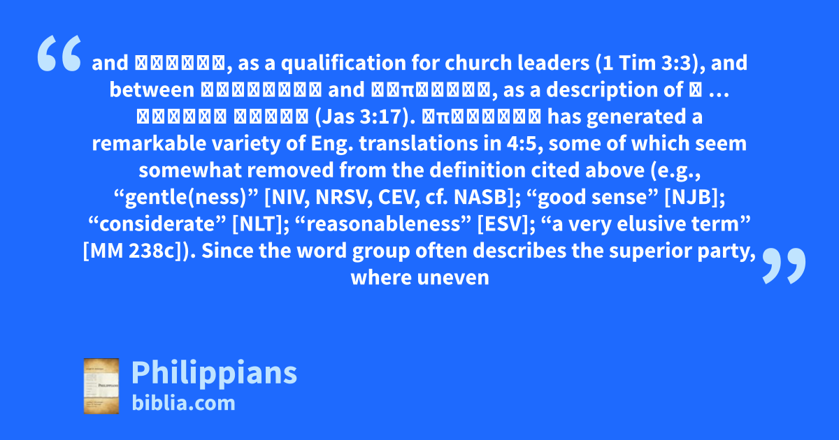 and ἄμαχον, as a qualification for church leaders (1 Tim 3:3), and between εἰρηνική and εὐπειθής, as a description of ἡ … ἄνωθεν σοφία (Jas 3:17). Ἐπιεικές has generated a remarkable variety of Eng. translations in 4:5, some of which seem somewhat removed from the definition cited above (e.g., “gentle(ness)” [NIV, NRSV, CEV, cf. NASB]; “good sense” [NJB]; “considerate” [NLT]; “reasonableness” [ESV]; “a very elusive term” [MM 238c]). Since the word group often describes the superior party, where uneven
