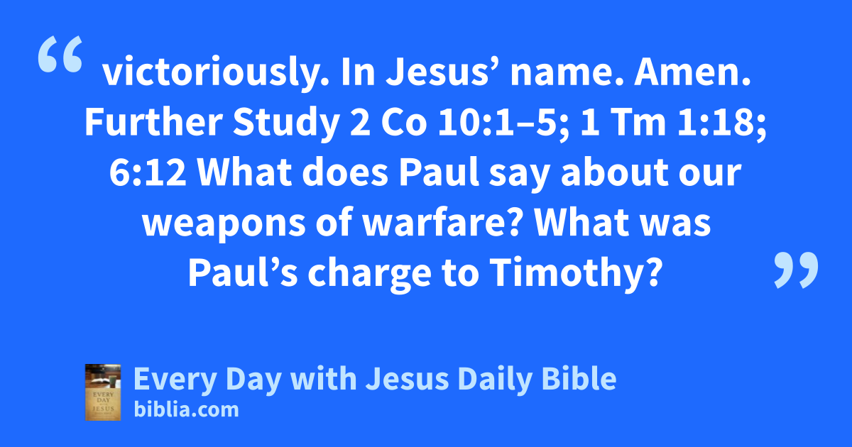 victoriously. In Jesus’ name. Amen. Further Study 2 Co 10:1–5; 1 Tm 1:18; 6:12 What does Paul say about our weapons of warfare? What was Paul’s charge to Timothy?