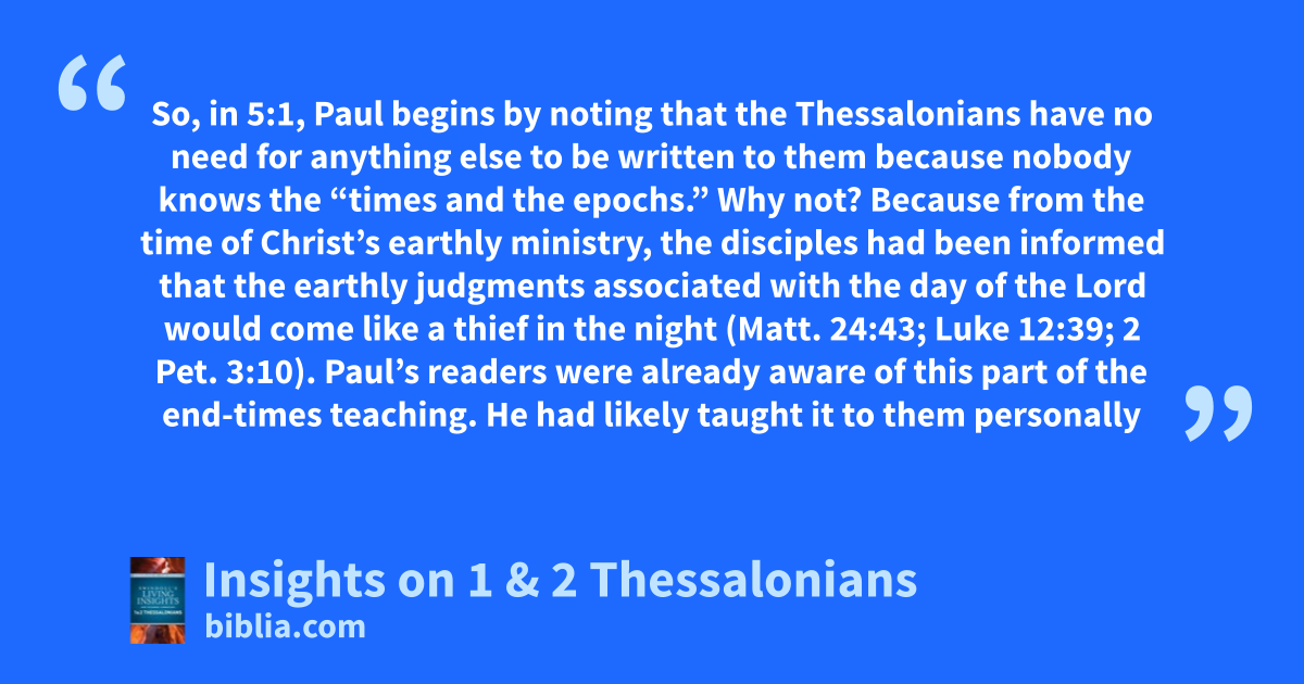 So, in 5:1, Paul begins by noting that the Thessalonians have no need for anything else to be written to them because nobody knows the “times and the epochs.” Why not? Because from the time of Christ’s earthly ministry, the disciples had been informed that the earthly judgments associated with the day of the Lord would come like a thief in the night (Matt. 24:43; Luke 12:39; 2 Pet. 3:10). Paul’s readers were already aware of this part of the end-times teaching. He had likely taught it to them personally