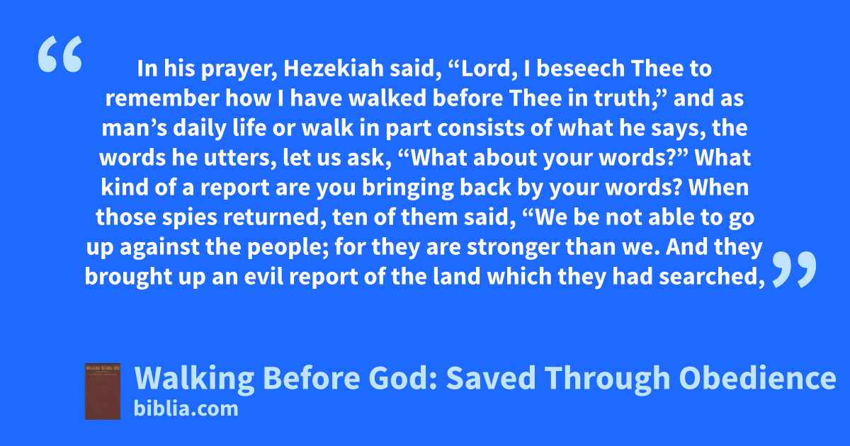 In his prayer, Hezekiah said, “Lord, I beseech Thee to remember how I have walked before Thee in truth,” and as man’s daily life or walk in part consists of what he says, the words he utters, let us ask, “What about your words?” What kind of a report are you bringing back by your words? When those spies returned, ten of them said, “We be not able to go up against the people; for they are stronger than we. And they brought up an evil report of the land which they had searched,