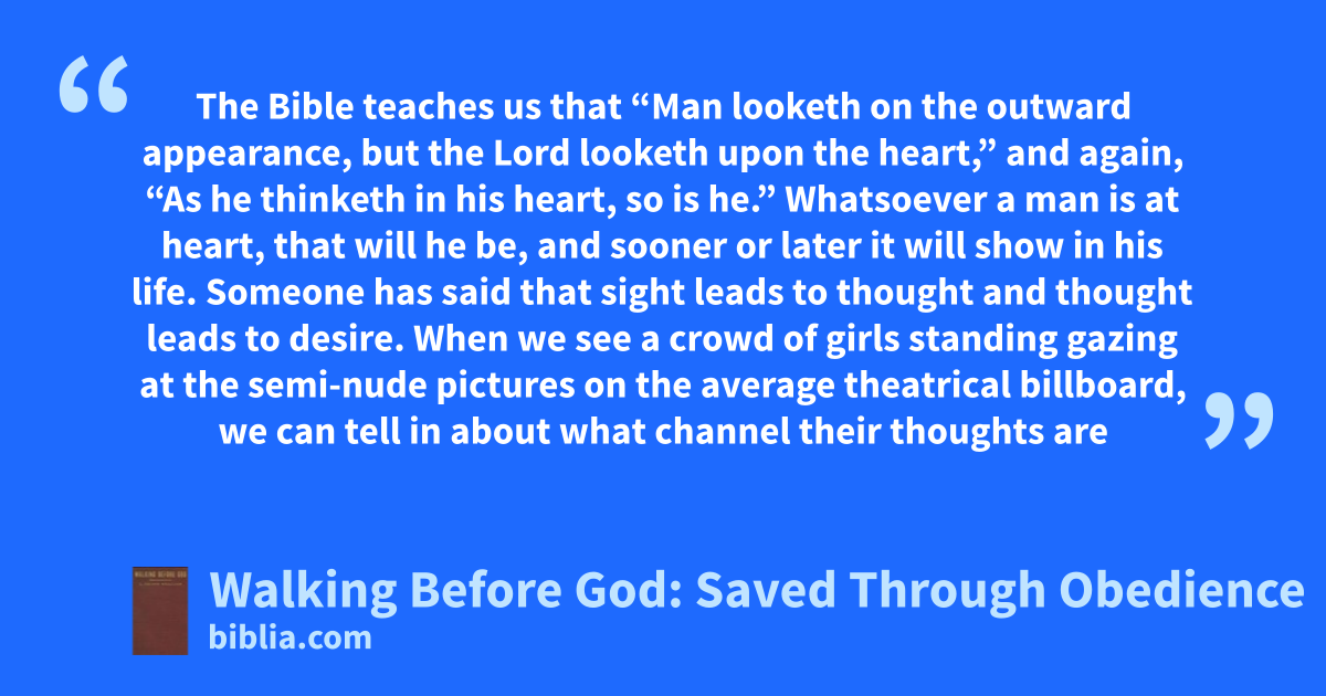 The Bible teaches us that “Man looketh on the outward appearance, but the Lord looketh upon the heart,” and again, “As he thinketh in his heart, so is he.” Whatsoever a man is at heart, that will he be, and sooner or later it will show in his life. Someone has said that sight leads to thought and thought leads to desire. When we see a crowd of girls standing gazing at the semi-nude pictures on the average theatrical billboard, we can tell in about what channel their thoughts are