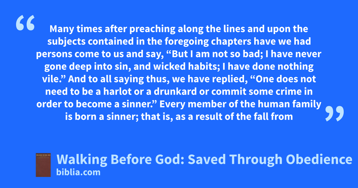 Many times after preaching along the lines and upon the subjects contained in the foregoing chapters have we had persons come to us and say, “But I am not so bad; I have never gone deep into sin, and wicked habits; I have done nothing vile.” And to all saying thus, we have replied, “One does not need to be a harlot or a drunkard or commit some crime in order to become a sinner.” Every member of the human family is born a sinner; that is, as a result of the fall from