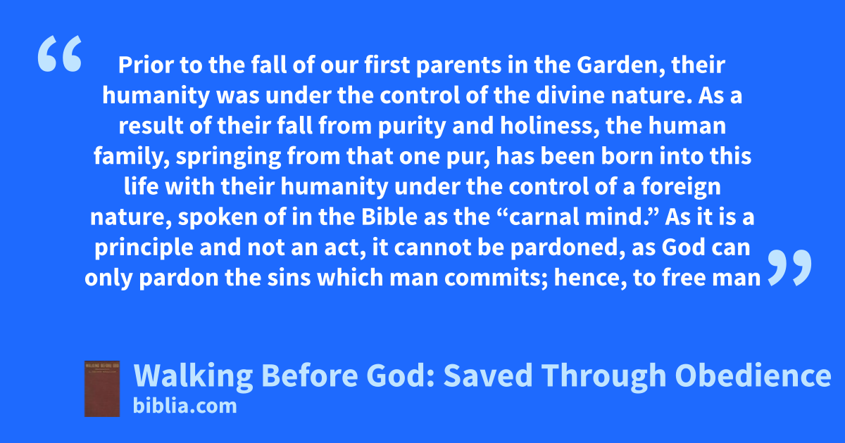 Prior to the fall of our first parents in the Garden, their humanity was under the control of the divine nature. As a result of their fall from purity and holiness, the human family, springing from that one pur, has been born into this life with their humanity under the control of a foreign nature, spoken of in the Bible as the “carnal mind.” As it is a principle and not an act, it cannot be pardoned, as God can only pardon the sins which man commits; hence, to free man