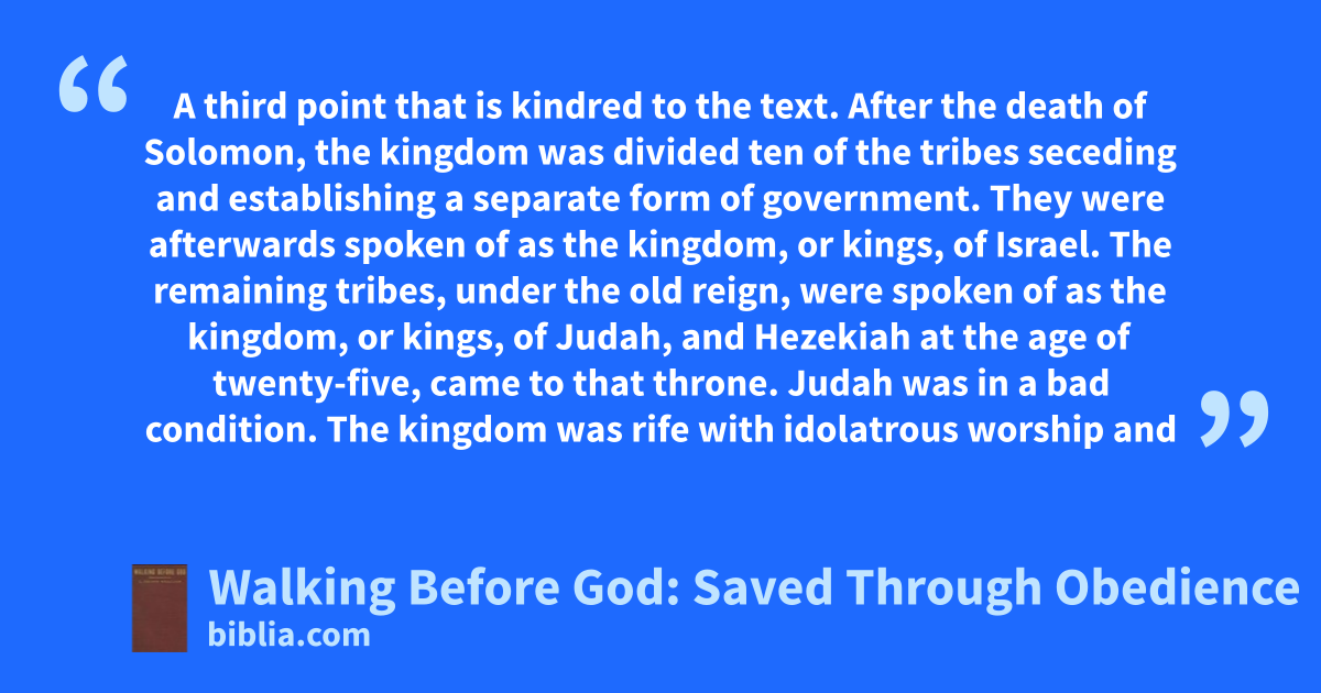 A third point that is kindred to the text. After the death of Solomon, the kingdom was divided ten of the tribes seceding and establishing a separate form of government. They were afterwards spoken of as the kingdom, or kings, of Israel. The remaining tribes, under the old reign, were spoken of as the kingdom, or kings, of Judah, and Hezekiah at the age of twenty-five, came to that throne. Judah was in a bad condition. The kingdom was rife with idolatrous worship and