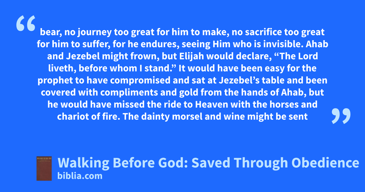 bear, no journey too great for him to make, no sacrifice too great for him to suffer, for he endures, seeing Him who is invisible. Ahab and Jezebel might frown, but Elijah would declare, “The Lord liveth, before whom I stand.” It would have been easy for the prophet to have compromised and sat at Jezebel’s table and been covered with compliments and gold from the hands of Ahab, but he would have missed the ride to Heaven with the horses and chariot of fire. The dainty morsel and wine might be sent
