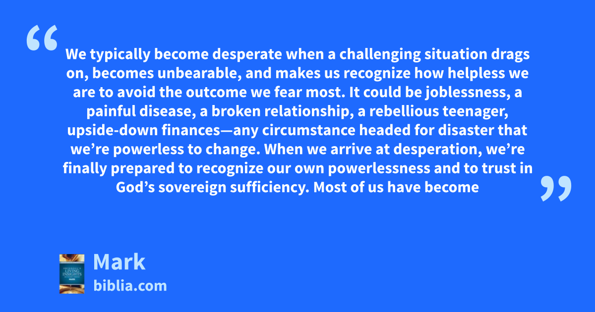 We typically become desperate when a challenging situation drags on, becomes unbearable, and makes us recognize how helpless we are to avoid the outcome we fear most. It could be joblessness, a painful disease, a broken relationship, a rebellious teenager, upside-down finances—any circumstance headed for disaster that we’re powerless to change. When we arrive at desperation, we’re finally prepared to recognize our own powerlessness and to trust in God’s sovereign sufficiency. Most of us have become