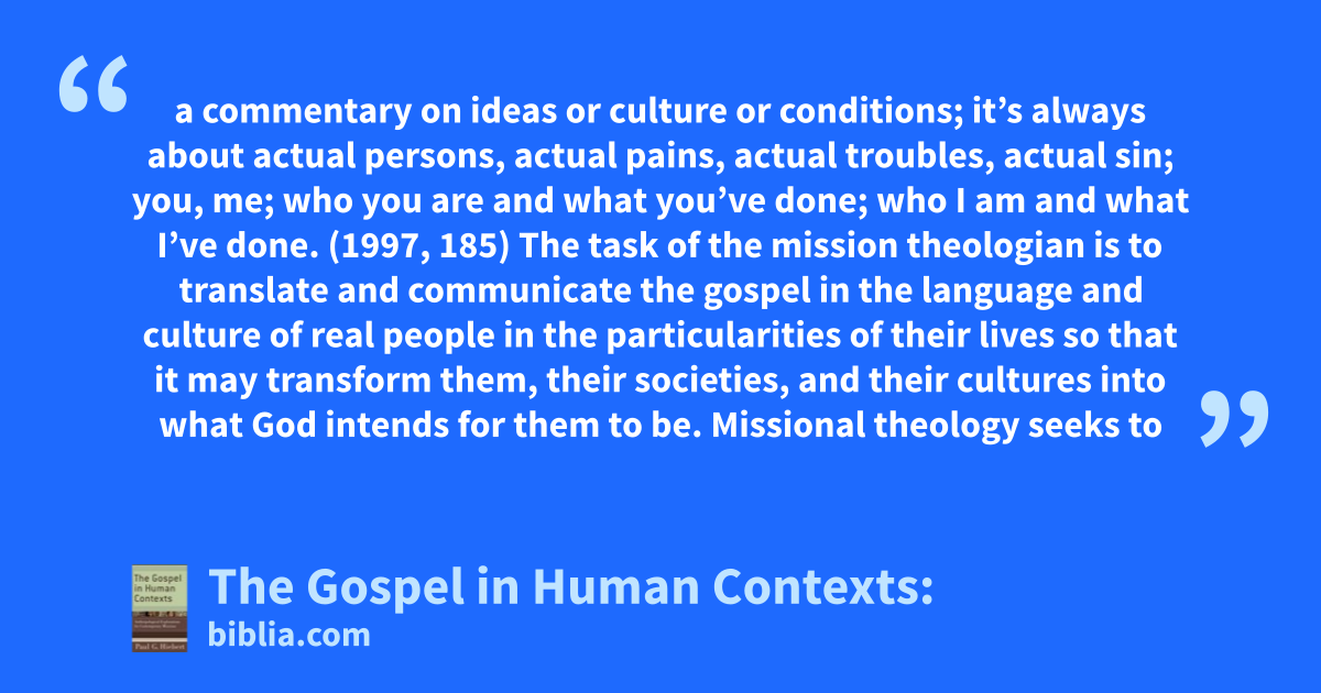a commentary on ideas or culture or conditions; it’s always about actual persons, actual pains, actual troubles, actual sin; you, me; who you are and what you’ve done; who I am and what I’ve done. (1997, 185) The task of the mission theologian is to translate and communicate the gospel in the language and culture of real people in the particularities of their lives so that it may transform them, their societies, and their cultures into what God intends for them to be. Missional theology seeks to