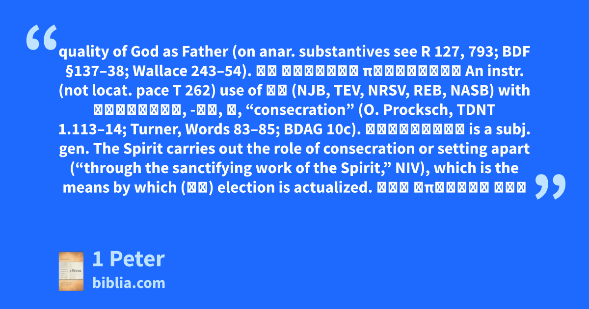 quality of God as Father (on anar. substantives see R 127, 793; BDF §137–38; Wallace 243–54). ἐν ἁγιασμῷ πνεύματος An instr. (not locat. pace T 262) use of ἐν (NJB, TEV, NRSV, REB, NASB) with ἁγιασμός, -οῦ, ὁ, “consecration” (O. Procksch, TDNT 1.113–14; Turner, Words 83–85; BDAG 10c). Πνεύματος is a subj. gen. The Spirit carries out the role of consecration or setting apart (“through the sanctifying work of the Spirit,” NIV), which is the means by which (ἐν) election is actualized. εἰς ὑπακοὴν καὶ