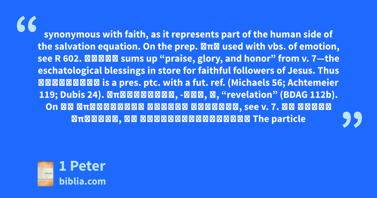 synonymous with faith, as it represents part of the human side of the salvation equation. On the prep. ἐπί used with vbs. of emotion, see R 602. Χάριν sums up “praise, glory, and honor” from v. 7—the eschatological blessings in store for faithful followers of Jesus. Thus φερομένην is a pres. ptc. with a fut. ref. (Michaels 56; Achtemeier 119; Dubis 24). Ἀποκάλυψις, -εως, ἡ, “revelation” (BDAG 112b). On ἐν ἀποκαλύψει ᾿Ιησοῦ Χριστοῦ, see v. 7. ὡς τέκνα ὑπακοῆς, μὴ συσχηματιζόμενοι The particle