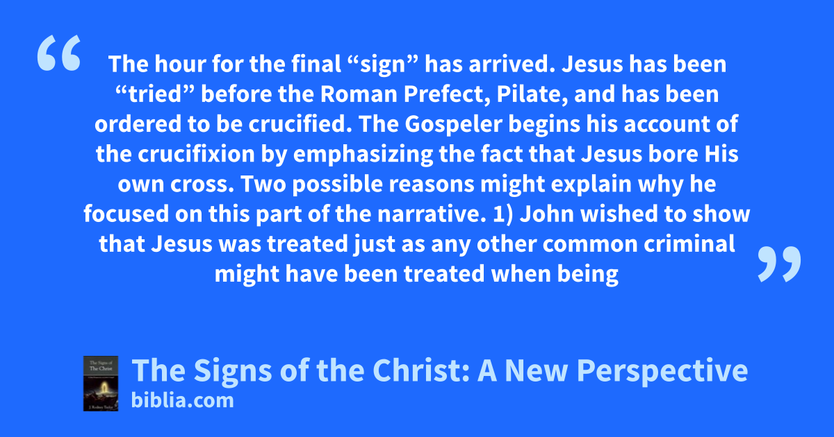 The hour for the final “sign” has arrived. Jesus has been “tried” before the Roman Prefect, Pilate, and has been ordered to be crucified. The Gospeler begins his account of the crucifixion by emphasizing the fact that Jesus bore His own cross. Two possible reasons might explain why he focused on this part of the narrative. 1) John wished to show that Jesus was treated just as any other common criminal might have been treated when being