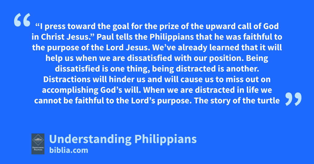 “I press toward the goal for the prize of the upward call of God in Christ Jesus.” Paul tells the Philippians that he was faithful to the purpose of the Lord Jesus. We’ve already learned that it will help us when we are dissatisfied with our position. Being dissatisfied is one thing, being distracted is another. Distractions will hinder us and will cause us to miss out on accomplishing God’s will. When we are distracted in life we cannot be faithful to the Lord’s purpose. The story of the turtle