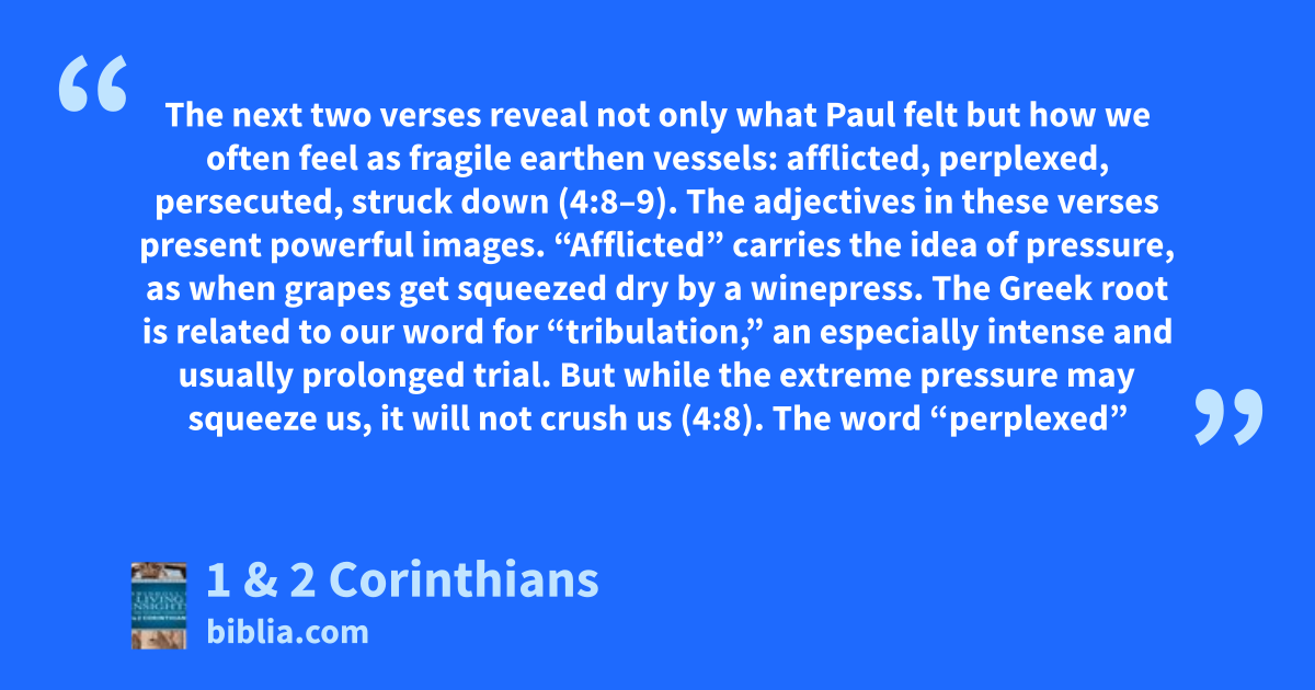 The next two verses reveal not only what Paul felt but how we often feel as fragile earthen vessels: afflicted, perplexed, persecuted, struck down (4:8–9). The adjectives in these verses present powerful images. “Afflicted” carries the idea of pressure, as when grapes get squeezed dry by a winepress. The Greek root is related to our word for “tribulation,” an especially intense and usually prolonged trial. But while the extreme pressure may squeeze us, it will not crush us (4:8). The word “perplexed”