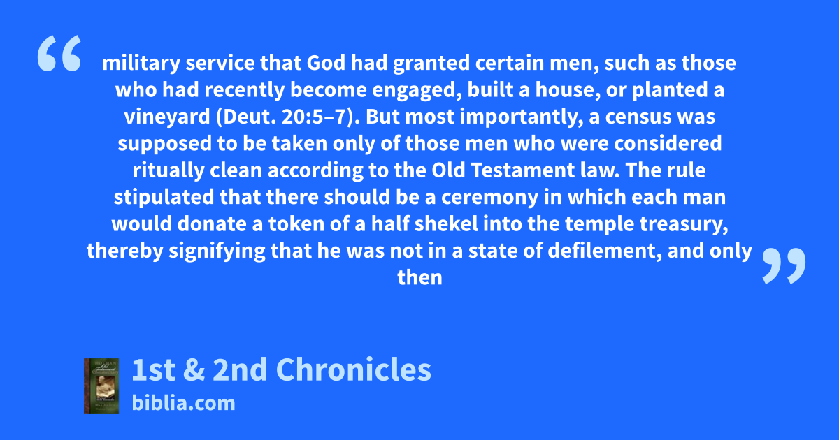 military service that God had granted certain men, such as those who had recently become engaged, built a house, or planted a vineyard (Deut. 20:5–7). But most importantly, a census was supposed to be taken only of those men who were considered ritually clean according to the Old Testament law. The rule stipulated that there should be a ceremony in which each man would donate a token of a half shekel into the temple treasury, thereby signifying that he was not in a state of defilement, and only then