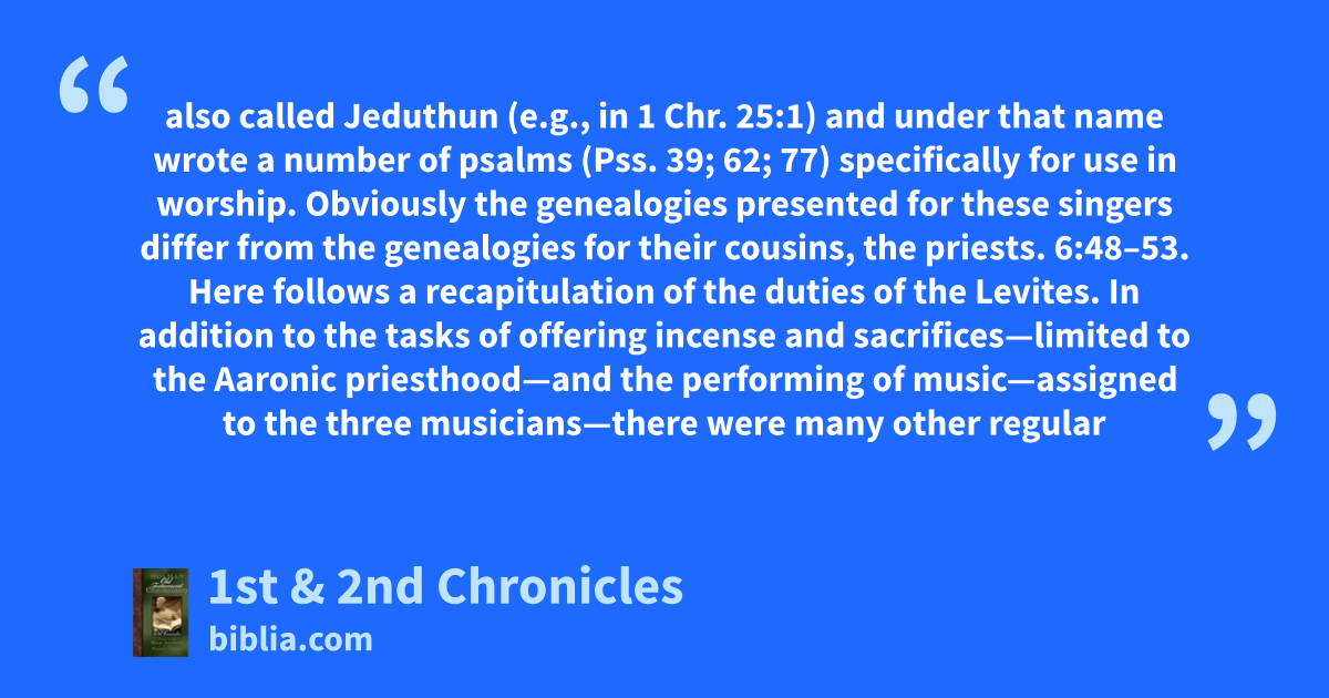 also called Jeduthun (e.g., in 1 Chr. 25:1) and under that name wrote a number of psalms (Pss. 39; 62; 77) specifically for use in worship. Obviously the genealogies presented for these singers differ from the genealogies for their cousins, the priests. 6:48–53. Here follows a recapitulation of the duties of the Levites. In addition to the tasks of offering incense and sacrifices—limited to the Aaronic priesthood—and the performing of music—assigned to the three musicians—there were many other regular