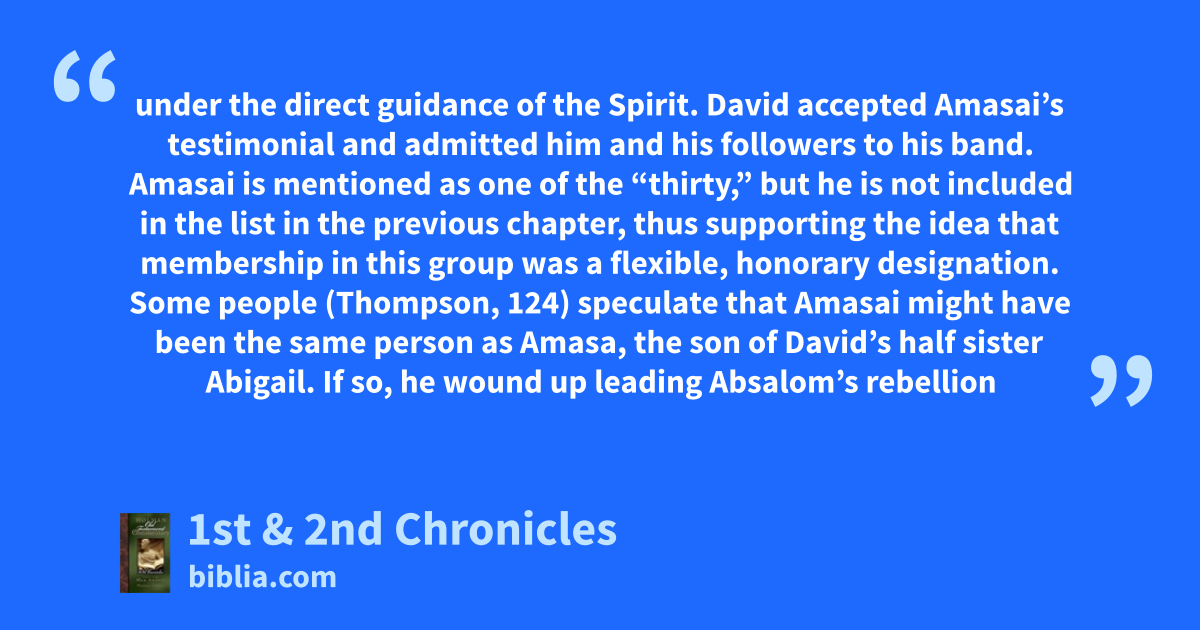 under the direct guidance of the Spirit. David accepted Amasai’s testimonial and admitted him and his followers to his band. Amasai is mentioned as one of the “thirty,” but he is not included in the list in the previous chapter, thus supporting the idea that membership in this group was a flexible, honorary designation. Some people (Thompson, 124) speculate that Amasai might have been the same person as Amasa, the son of David’s half sister Abigail. If so, he wound up leading Absalom’s rebellion