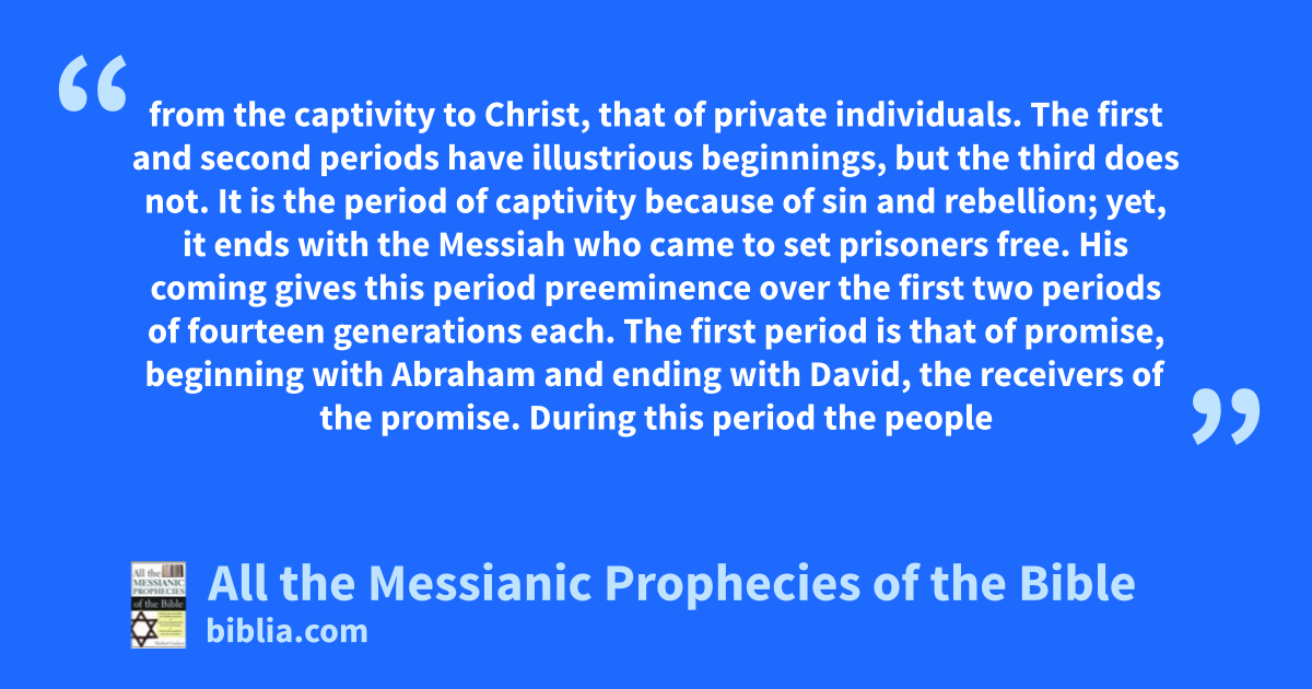 from the captivity to Christ, that of private individuals. The first and second periods have illustrious beginnings, but the third does not. It is the period of captivity because of sin and rebellion; yet, it ends with the Messiah who came to set prisoners free. His coming gives this period preeminence over the first two periods of fourteen generations each. The first period is that of promise, beginning with Abraham and ending with David, the receivers of the promise. During this period the people