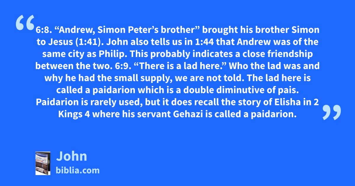6:8. “Andrew, Simon Peter’s brother” brought his brother Simon to Jesus (1:41). John also tells us in 1:44 that Andrew was of the same city as Philip. This probably indicates a close friendship between the two. 6:9. “There is a lad here.” Who the lad was and why he had the small supply, we are not told. The lad here is called a paidarion which is a double diminutive of pais. Paidarion is rarely used, but it does recall the story of Elisha in 2 Kings 4 where his servant Gehazi is called a paidarion.