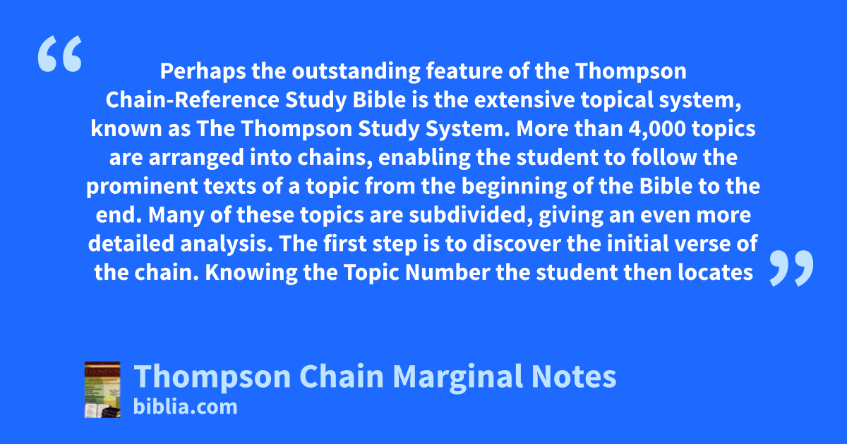 Perhaps the outstanding feature of the Thompson Chain-Reference Study Bible is the extensive topical system, known as The Thompson Study System. More than 4,000 topics are arranged into chains, enabling the student to follow the prominent texts of a topic from the beginning of the Bible to the end. Many of these topics are subdivided, giving an even more detailed analysis. The first step is to discover the initial verse of the chain. Knowing the Topic Number the student then locates