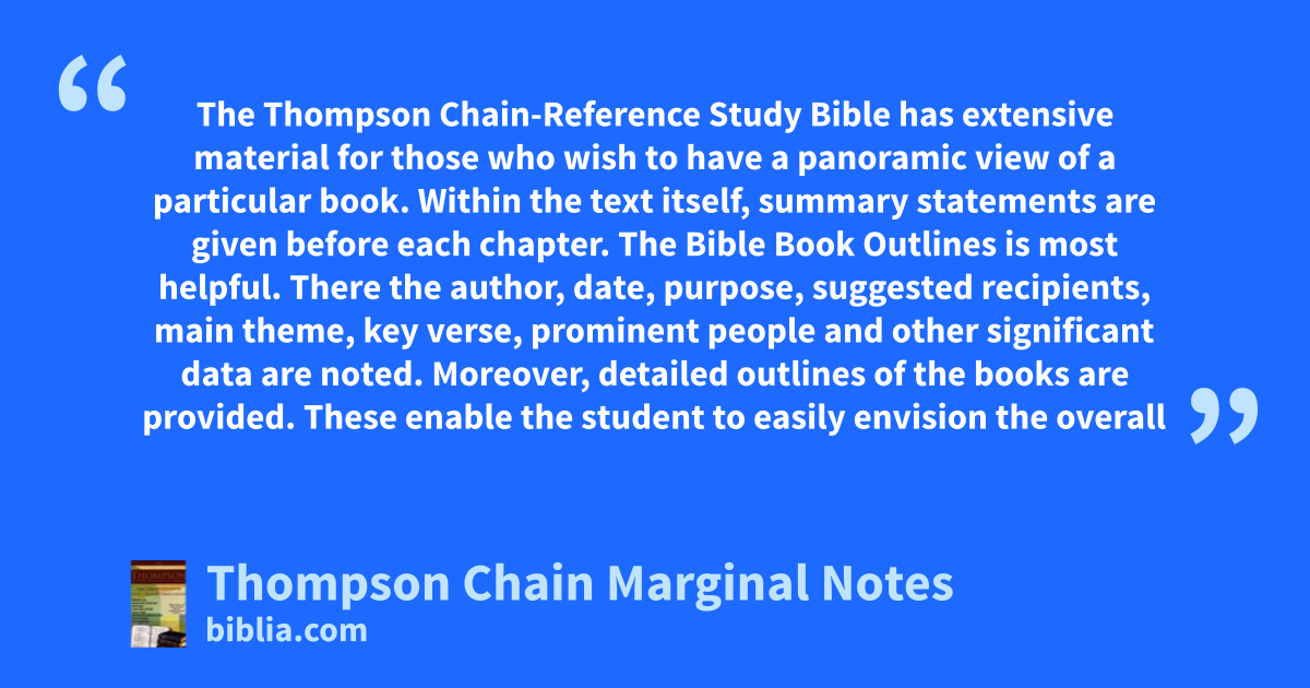 The Thompson Chain-Reference Study Bible has extensive material for those who wish to have a panoramic view of a particular book. Within the text itself, summary statements are given before each chapter. The Bible Book Outlines is most helpful. There the author, date, purpose, suggested recipients, main theme, key verse, prominent people and other significant data are noted. Moreover, detailed outlines of the books are provided. These enable the student to easily envision the overall