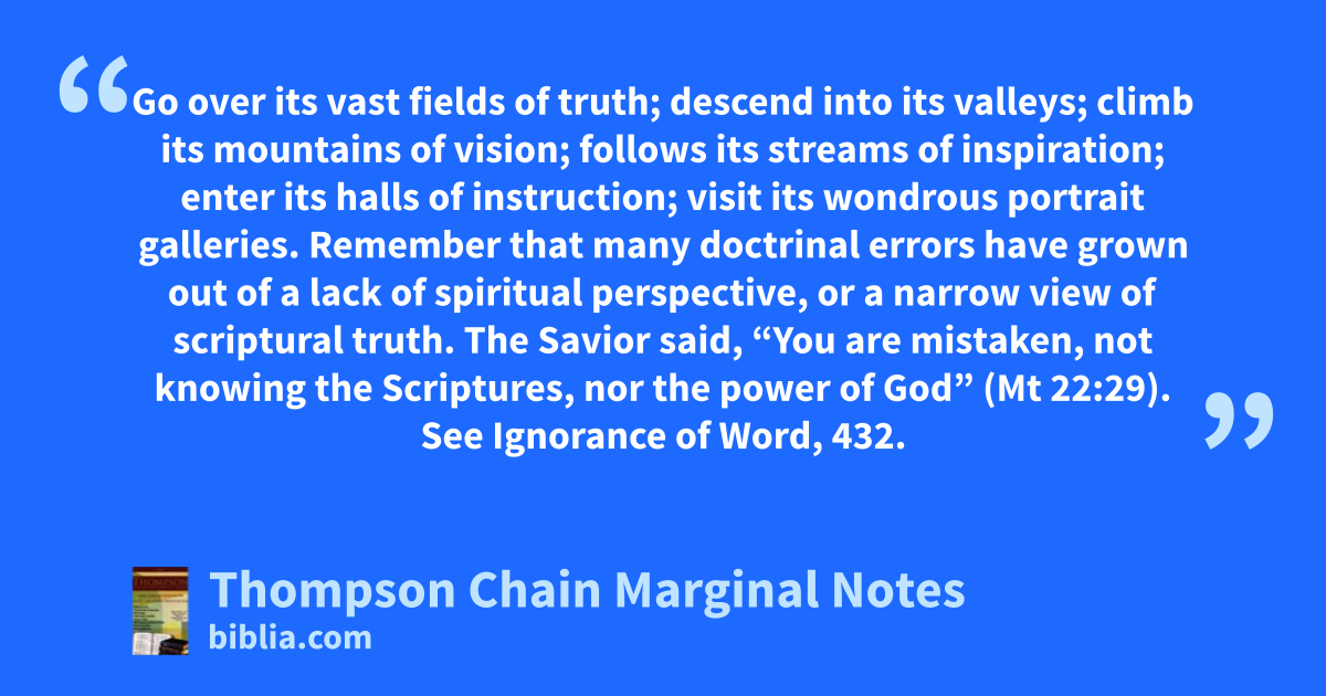 Go over its vast fields of truth; descend into its valleys; climb its mountains of vision; follows its streams of inspiration; enter its halls of instruction; visit its wondrous portrait galleries. Remember that many doctrinal errors have grown out of a lack of spiritual perspective, or a narrow view of scriptural truth. The Savior said, “You are mistaken, not knowing the Scriptures, nor the power of God” (Mt 22:29). See Ignorance of Word, 432.