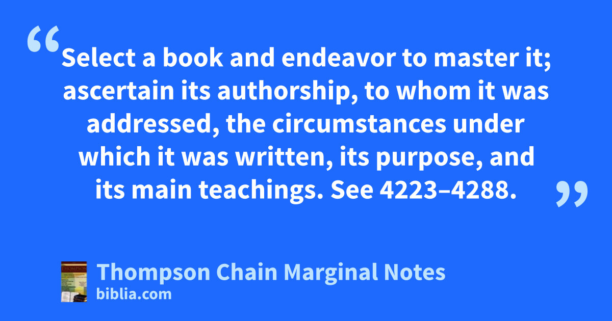 Select a book and endeavor to master it; ascertain its authorship, to whom it was addressed, the circumstances under which it was written, its purpose, and its main teachings. See 4223–4288.