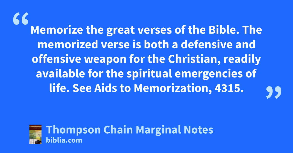 Memorize the great verses of the Bible. The memorized verse is both a defensive and offensive weapon for the Christian, readily available for the spiritual emergencies of life. See Aids to Memorization, 4315.