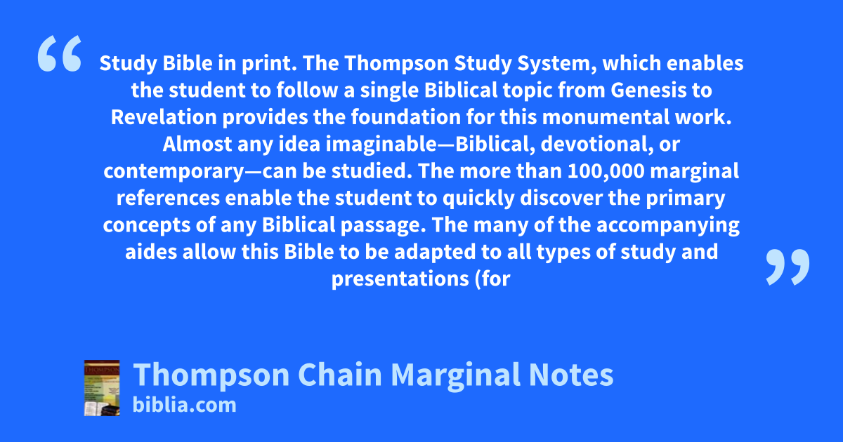 Study Bible in print. The Thompson Study System, which enables the student to follow a single Biblical topic from Genesis to Revelation provides the foundation for this monumental work. Almost any idea imaginable—Biblical, devotional, or contemporary—can be studied. The more than 100,000 marginal references enable the student to quickly discover the primary concepts of any Biblical passage. The many of the accompanying aides allow this Bible to be adapted to all types of study and presentations (for