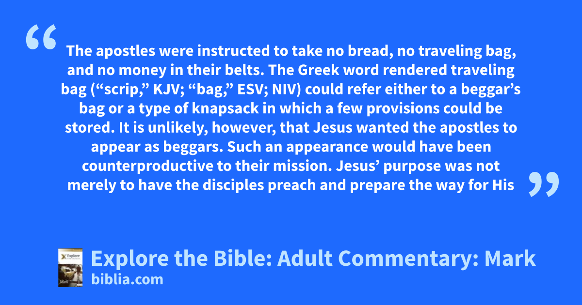 The apostles were instructed to take no bread, no traveling bag, and no money in their belts. The Greek word rendered traveling bag (“scrip,” KJV; “bag,” ESV; NIV) could refer either to a beggar’s bag or a type of knapsack in which a few provisions could be stored. It is unlikely, however, that Jesus wanted the apostles to appear as beggars. Such an appearance would have been counterproductive to their mission. Jesus’ purpose was not merely to have the disciples preach and prepare the way for His