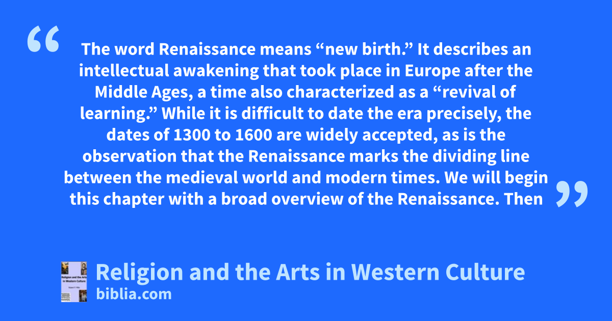 The word Renaissance means “new birth.” It describes an intellectual awakening that took place in Europe after the Middle Ages, a time also characterized as a “revival of learning.” While it is difficult to date the era precisely, the dates of 1300 to 1600 are widely accepted, as is the observation that the Renaissance marks the dividing line between the medieval world and modern times. We will begin this chapter with a broad overview of the Renaissance. Then