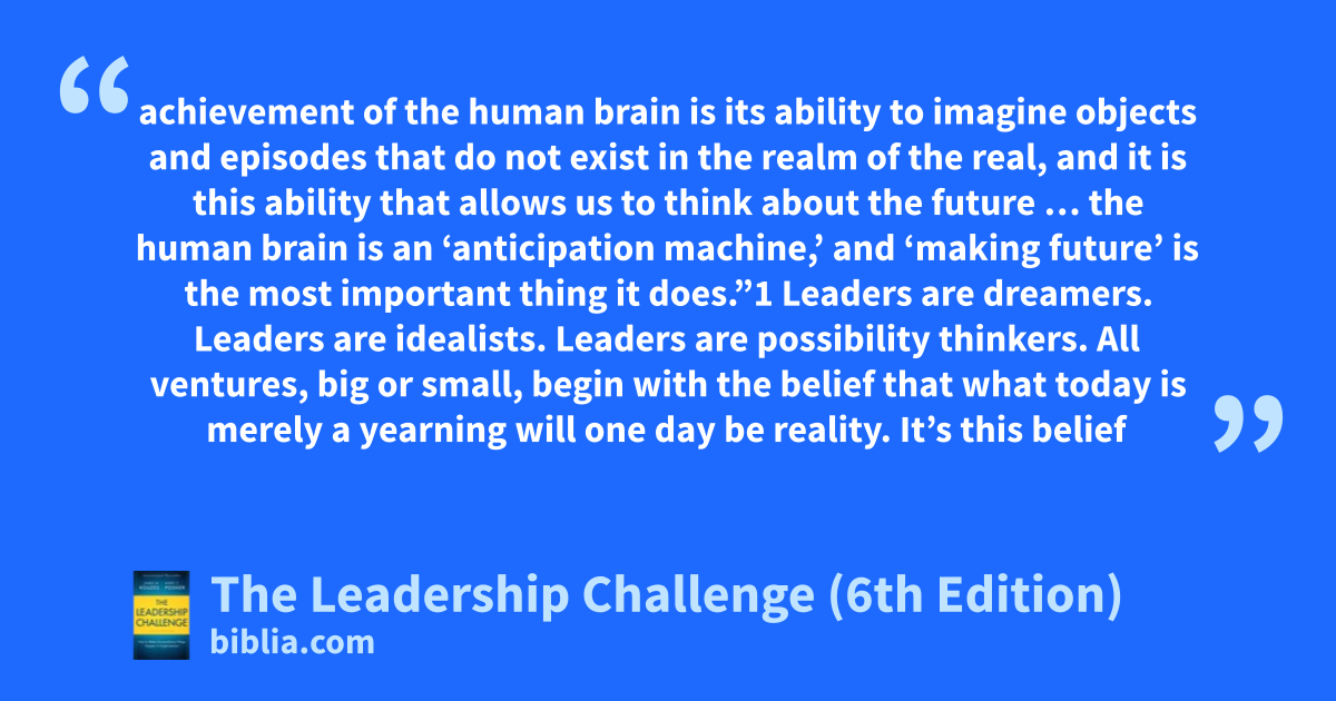 achievement of the human brain is its ability to imagine objects and episodes that do not exist in the realm of the real, and it is this ability that allows us to think about the future … the human brain is an ‘anticipation machine,’ and ‘making future’ is the most important thing it does.”1 Leaders are dreamers. Leaders are idealists. Leaders are possibility thinkers. All ventures, big or small, begin with the belief that what today is merely a yearning will one day be reality. It’s this belief