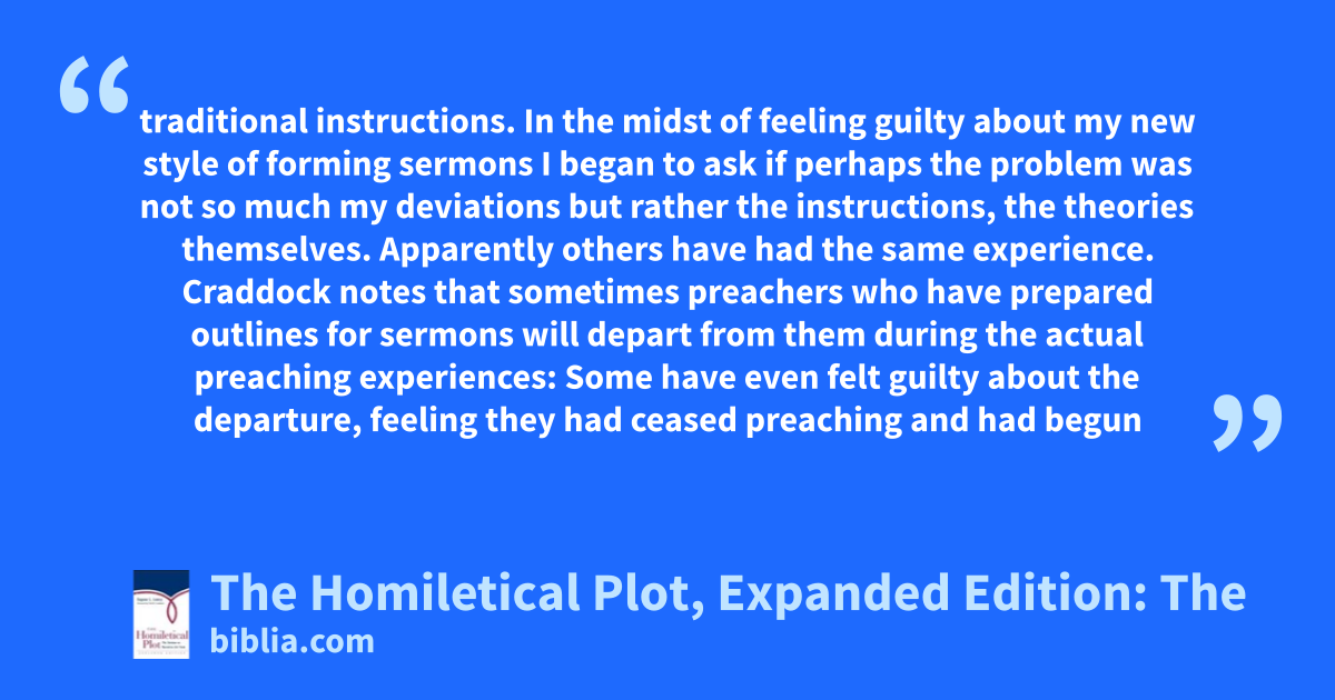 traditional instructions. In the midst of feeling guilty about my new style of forming sermons I began to ask if perhaps the problem was not so much my deviations but rather the instructions, the theories themselves. Apparently others have had the same experience. Craddock notes that sometimes preachers who have prepared outlines for sermons will depart from them during the actual preaching experiences: Some have even felt guilty about the departure, feeling they had ceased preaching and had begun