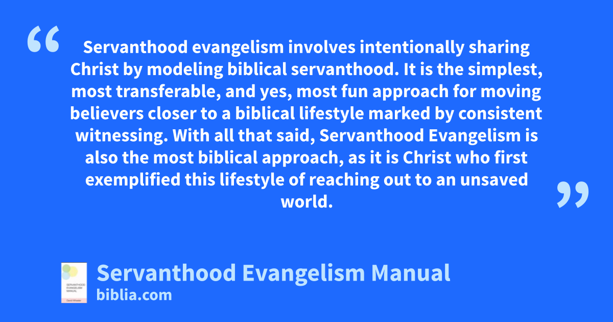 Servanthood evangelism involves intentionally sharing Christ by modeling biblical servanthood. It is the simplest, most transferable, and yes, most fun approach for moving believers closer to a biblical lifestyle marked by consistent witnessing. With all that said, Servanthood Evangelism is also the most biblical approach, as it is Christ who first exemplified this lifestyle of reaching out to an unsaved world.