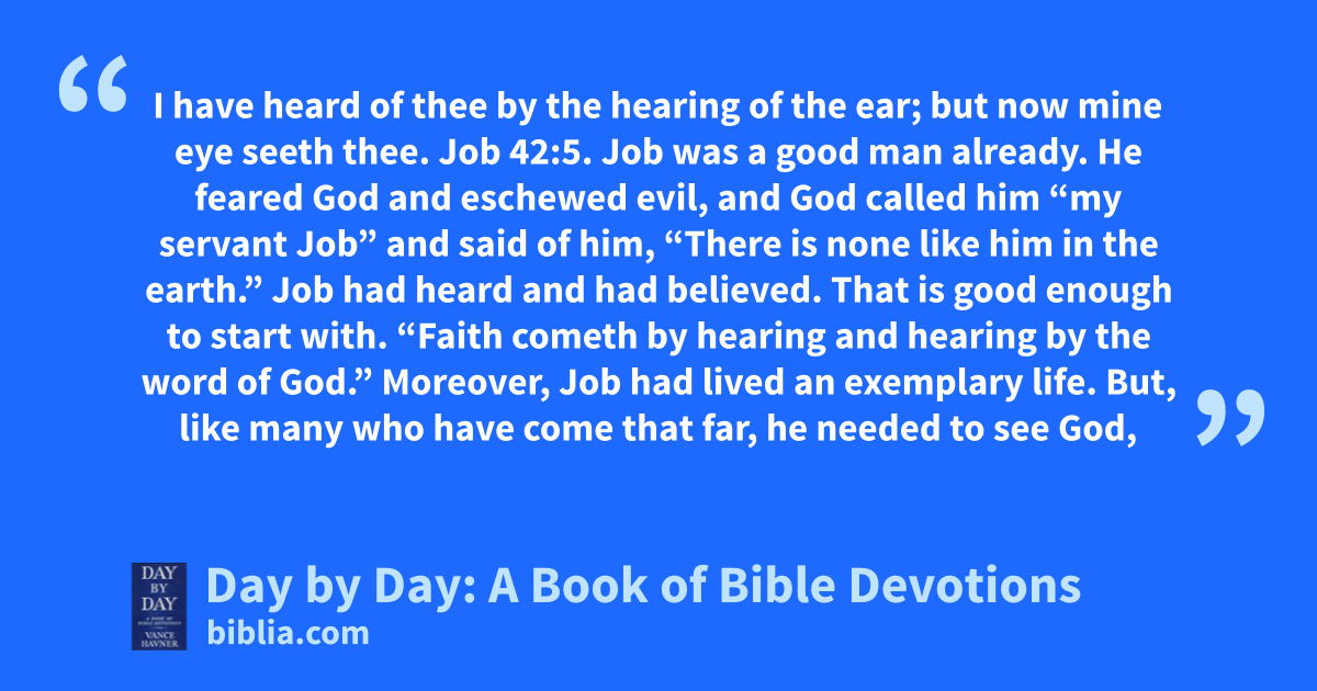 I have heard of thee by the hearing of the ear; but now mine eye seeth thee. Job 42:5. Job was a good man already. He feared God and eschewed evil, and God called him “my servant Job” and said of him, “There is none like him in the earth.” Job had heard and had believed. That is good enough to start with. “Faith cometh by hearing and hearing by the word of God.” Moreover, Job had lived an exemplary life. But, like many who have come that far, he needed to see God,