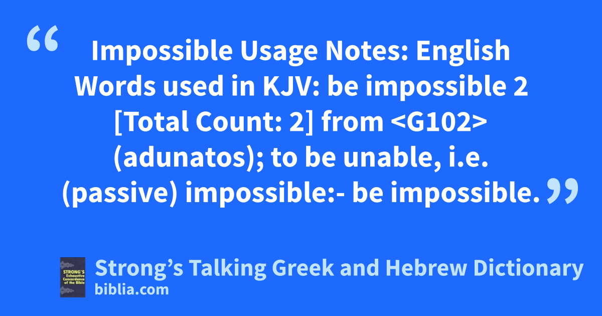 Impossible Usage Notes: English Words used in KJV: be impossible 2 [Total Count: 2] from (adunatos); to be unable, i.e. (passive) impossible:- be impossible.