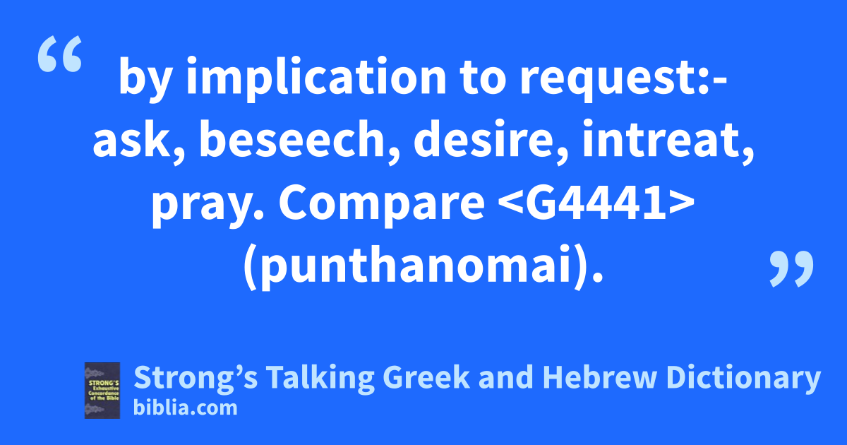 by implication to request:- ask, beseech, desire, intreat, pray. Compare (punthanomai).