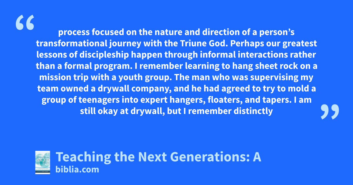 process focused on the nature and direction of a person’s transformational journey with the Triune God. Perhaps our greatest lessons of discipleship happen through informal interactions rather than a formal program. I remember learning to hang sheet rock on a mission trip with a youth group. The man who was supervising my team owned a drywall company, and he had agreed to try to mold a group of teenagers into expert hangers, floaters, and tapers. I am still okay at drywall, but I remember distinctly