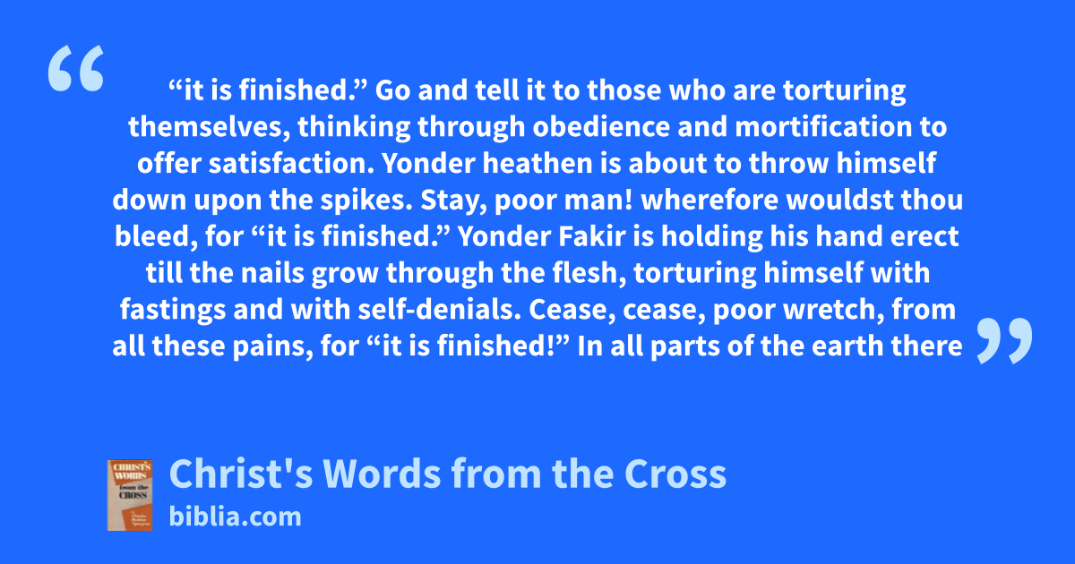 “it is finished.” Go and tell it to those who are torturing themselves, thinking through obedience and mortification to offer satisfaction. Yonder heathen is about to throw himself down upon the spikes. Stay, poor man! wherefore wouldst thou bleed, for “it is finished.” Yonder Fakir is holding his hand erect till the nails grow through the flesh, torturing himself with fastings and with self-denials. Cease, cease, poor wretch, from all these pains, for “it is finished!” In all parts of the earth there