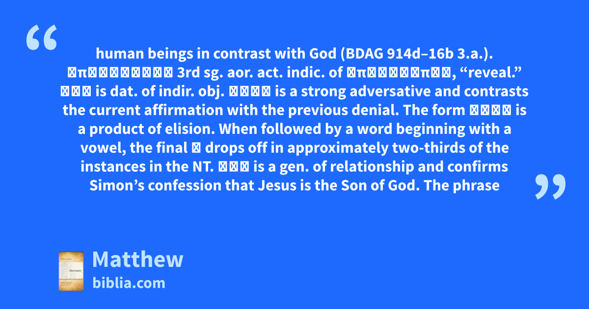 human beings in contrast with God (BDAG 914d–16b 3.a.). Ἀπεκάλυψεν 3rd sg. aor. act. indic. of ἀποκαλύπτω, “reveal.” Σοι is dat. of indir. obj. Ἀλλά is a strong adversative and contrasts the current affirmation with the previous denial. The form ἀλλ᾿ is a product of elision. When followed by a word beginning with a vowel, the final α drops off in approximately two-thirds of the instances in the NT. Μου is a gen. of relationship and confirms Simon’s confession that Jesus is the Son of God. The phrase