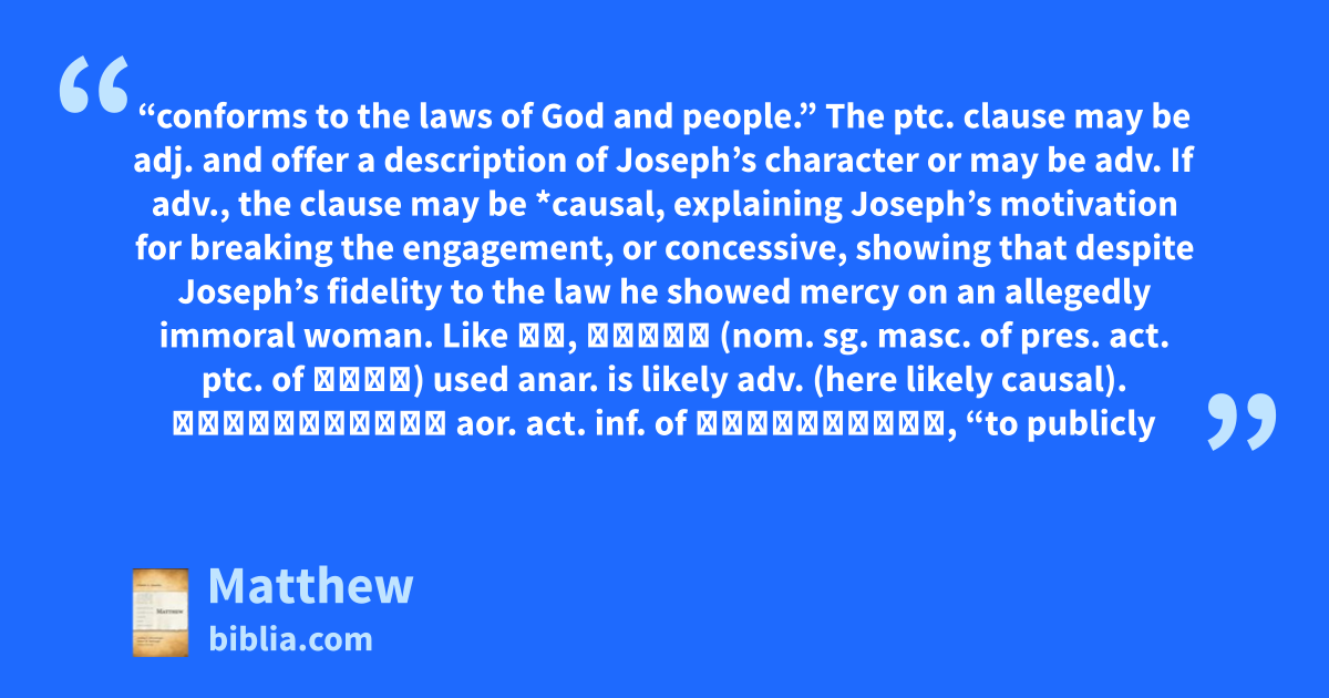 “conforms to the laws of God and people.” The ptc. clause may be adj. and offer a description of Joseph’s character or may be adv. If adv., the clause may be *causal, explaining Joseph’s motivation for breaking the engagement, or concessive, showing that despite Joseph’s fidelity to the law he showed mercy on an allegedly immoral woman. Like ὤν, θέλων (nom. sg. masc. of pres. act. ptc. of θέλω) used anar. is likely adv. (here likely causal). Δειγματίσαι aor. act. inf. of δειγματίζω, “to publicly