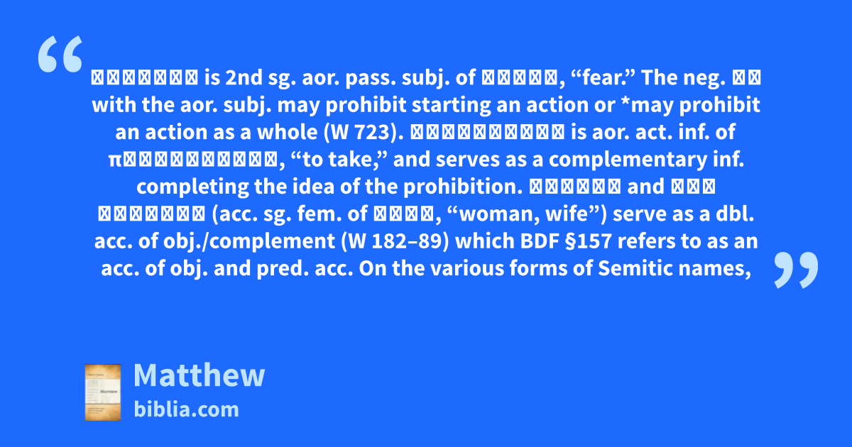 Φοβηθῇς is 2nd sg. aor. pass. subj. of φοβέω, “fear.” The neg. μή with the aor. subj. may prohibit starting an action or *may prohibit an action as a whole (W 723). Παραλαβεῖν is aor. act. inf. of παραλαμβάνω, “to take,” and serves as a complementary inf. completing the idea of the prohibition. Μαρίαν and τὴν γυναῖκα (acc. sg. fem. of γυνή, “woman, wife”) serve as a dbl. acc. of obj./complement (W 182–89) which BDF §157 refers to as an acc. of obj. and pred. acc. On the various forms of Semitic names,