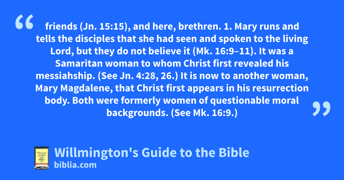 friends (Jn. 15:15), and here, brethren. 1. Mary runs and tells the disciples that she had seen and spoken to the living Lord, but they do not believe it (Mk. 16:9–11). It was a Samaritan woman to whom Christ first revealed his messiahship. (See Jn. 4:28, 26.) It is now to another woman, Mary Magdalene, that Christ first appears in his resurrection body. Both were formerly women of questionable moral backgrounds. (See Mk. 16:9.)
