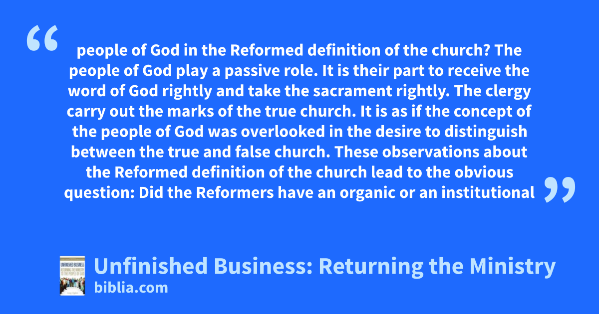 people of God in the Reformed definition of the church? The people of God play a passive role. It is their part to receive the word of God rightly and take the sacrament rightly. The clergy carry out the marks of the true church. It is as if the concept of the people of God was overlooked in the desire to distinguish between the true and false church. These observations about the Reformed definition of the church lead to the obvious question: Did the Reformers have an organic or an institutional